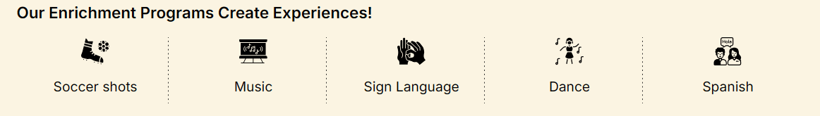 To provide a diverse and well-rounded experience, we offer a range of complementary enrichment activities, including our popular Soccer Shots, Music, Sign Language, Dance, and foreign language classes (Spanish).